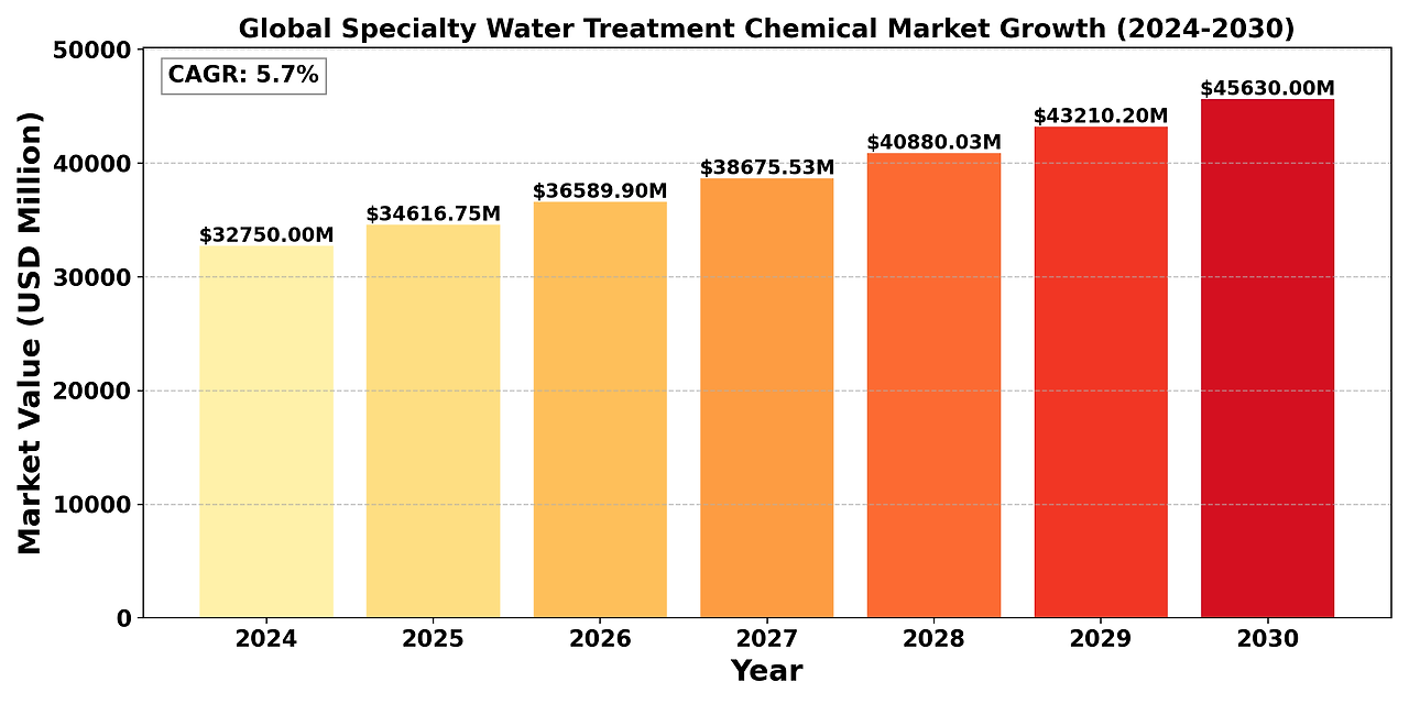 The "Global Specialty Water Treatment Chemical Market" size was valued at US$ 32.75 billion in 2024 and is projected to reach US$ 45.63 billion by 2030, at a CAGR of 5.7% during the forecast period 2024-2030.