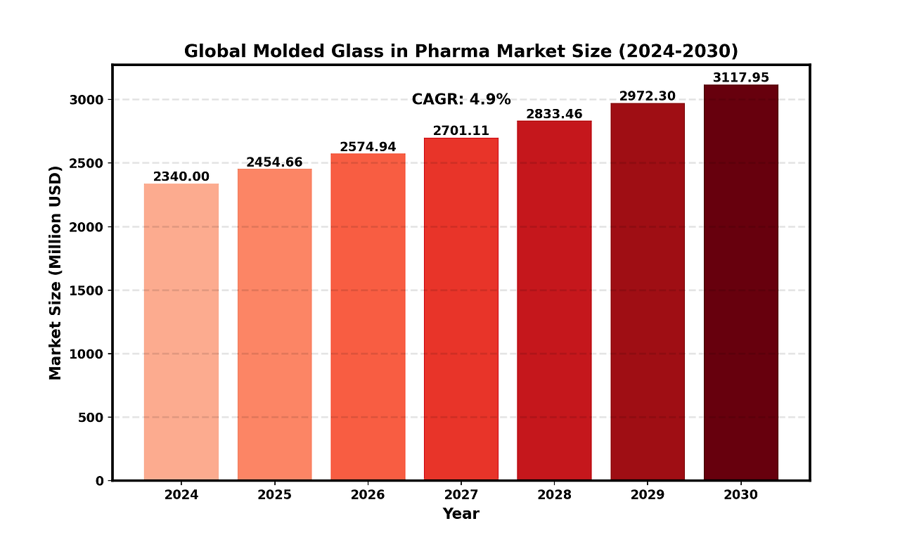The global Molded Glass in Pharma market size was valued at US$ 2.34 billion in 2024 and is projected to reach US$ 3.11 billion by 2030, at a CAGR of 4.9% during the forecast period 2024-2030.