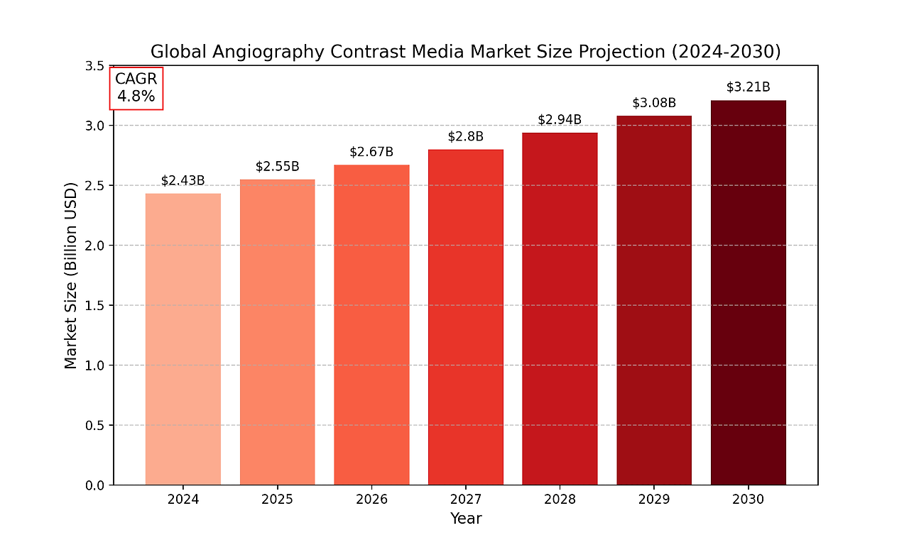 The global Angiography Contrast Media market size was valued at US$ 2.43 billion in 2024 and is projected to reach US$ 3.21 billion by 2030, at a CAGR of 4.8% during the forecast period 2024-2030.