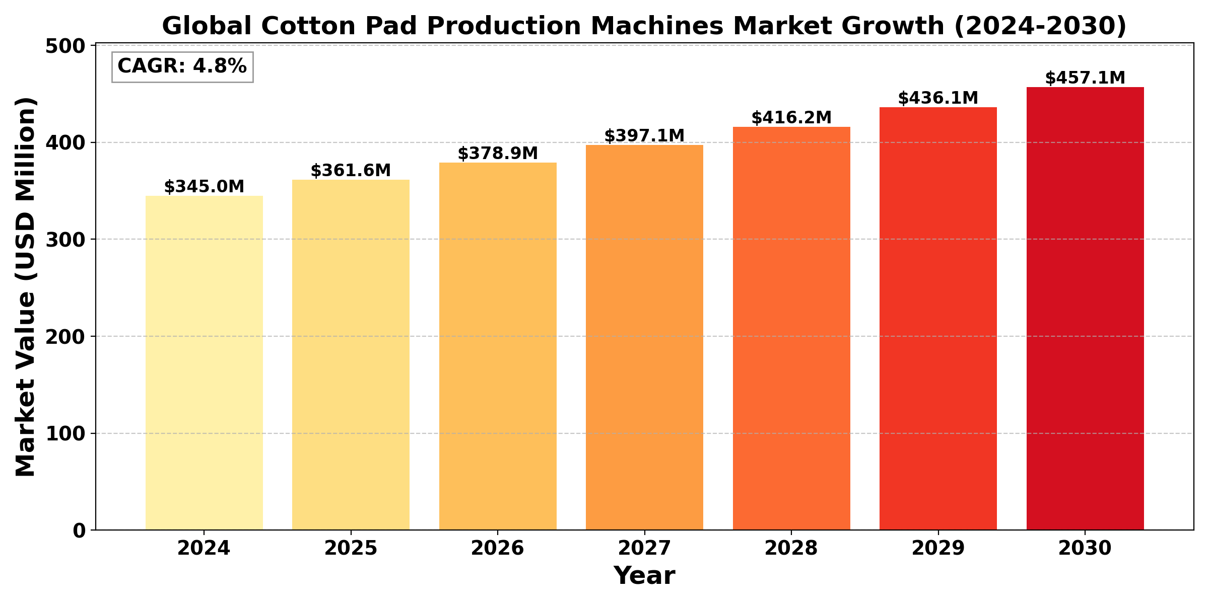 The "Global Cotton Pad Production Machines Market" size was valued at US$ 345 million in 2024 and is projected to reach US$ 457.1 million by 2030, at a CAGR of 4.8% during the forecast period 2024-2030.