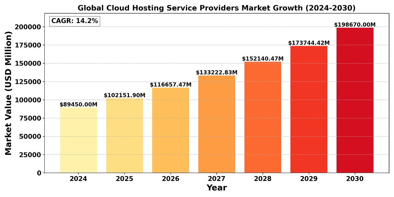 The "Global Cloud Hosting Service Providers Market" size was valued at US$ 89.45 billion in 2024 and is projected to reach US$ 198.67 billion by 2030, at a CAGR of 14.2% during the forecast period 2024-2030.