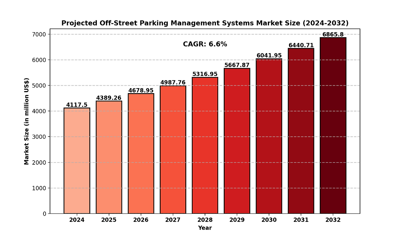 The global Off-Street Parking Management Systems market size was estimated at USD 4117.50 million in 2024 and is projected to reach USD 6865.8 million by 2032, exhibiting a CAGR of 6.60% during the forecast period.