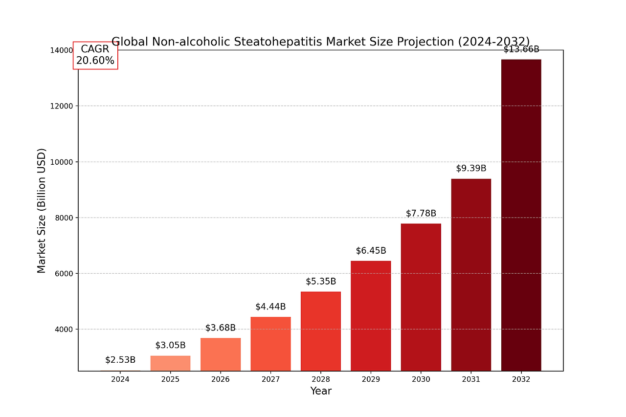 The global Non-alcoholic Steatohepatitis market size was estimated at USD 2532 million in 2024 and is projected to reach USD 13664.37 million by 2032, exhibiting a CAGR of 20.60% during the forecast period.