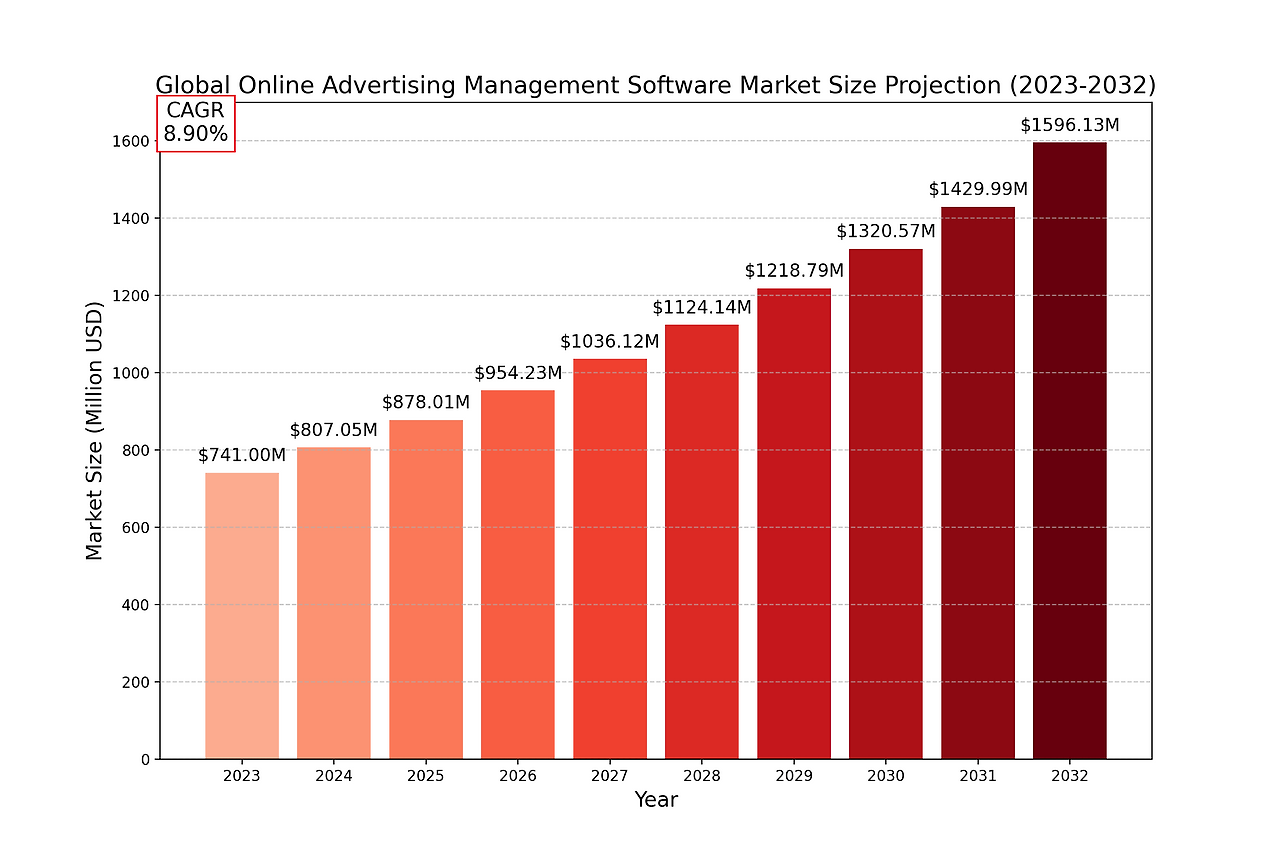 The "Global Online Advertising Management Software Market" size was estimated at USD 741 million in 2023 and is projected to reach USD 1596.13 million by 2032, exhibiting a CAGR of 8.90% during the forecast period.