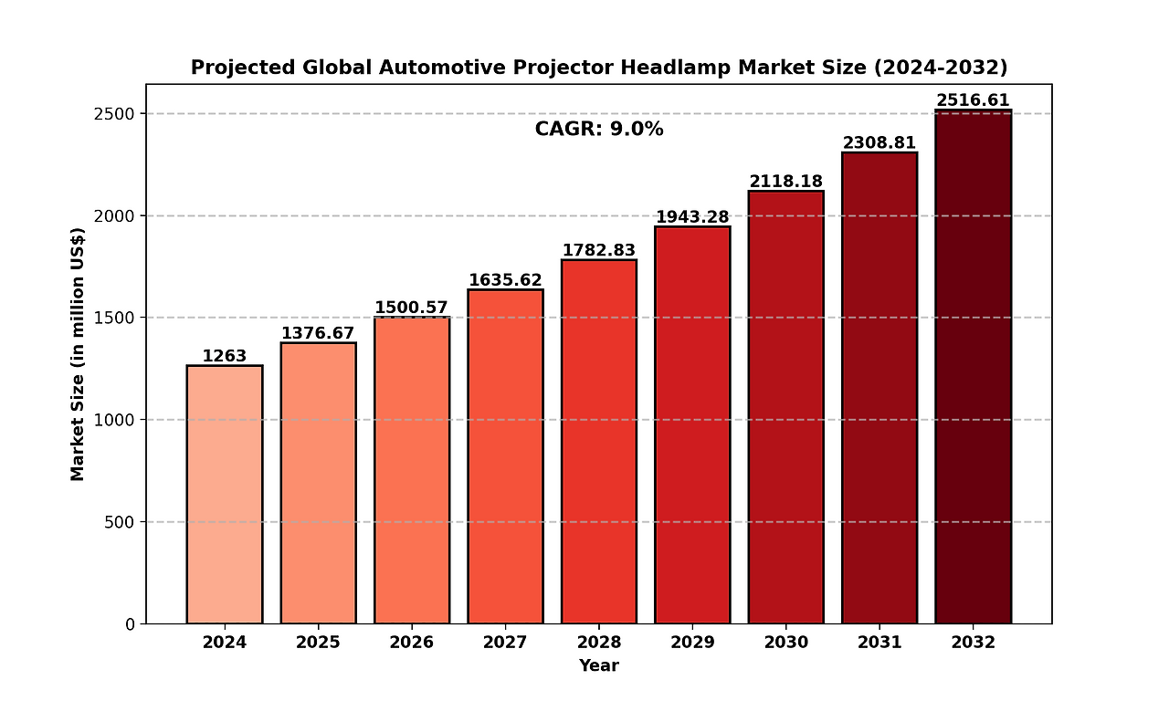 The global Automotive Projector Headlamp market size was estimated at USD 1263 million in 2024 and is projected to reach USD 2516.61 million by 2032, exhibiting a CAGR of 9.00% during the forecast period.