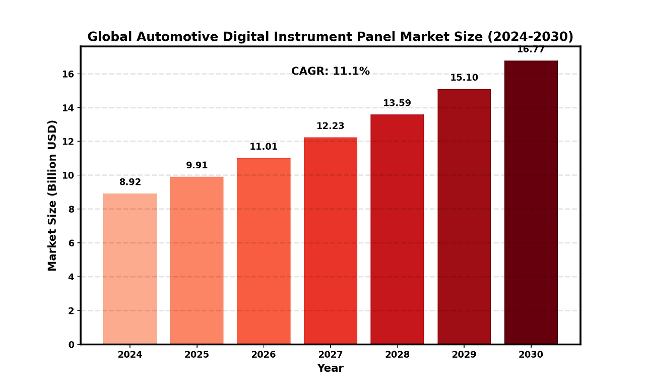 The global Automotive Digital Instrument Panel market size was valued at US$ 8.92 billion in 2024 and is projected to reach US$ 16.77 billion by 2030, at a CAGR of 11.1% during the forecast period 2024-2030.