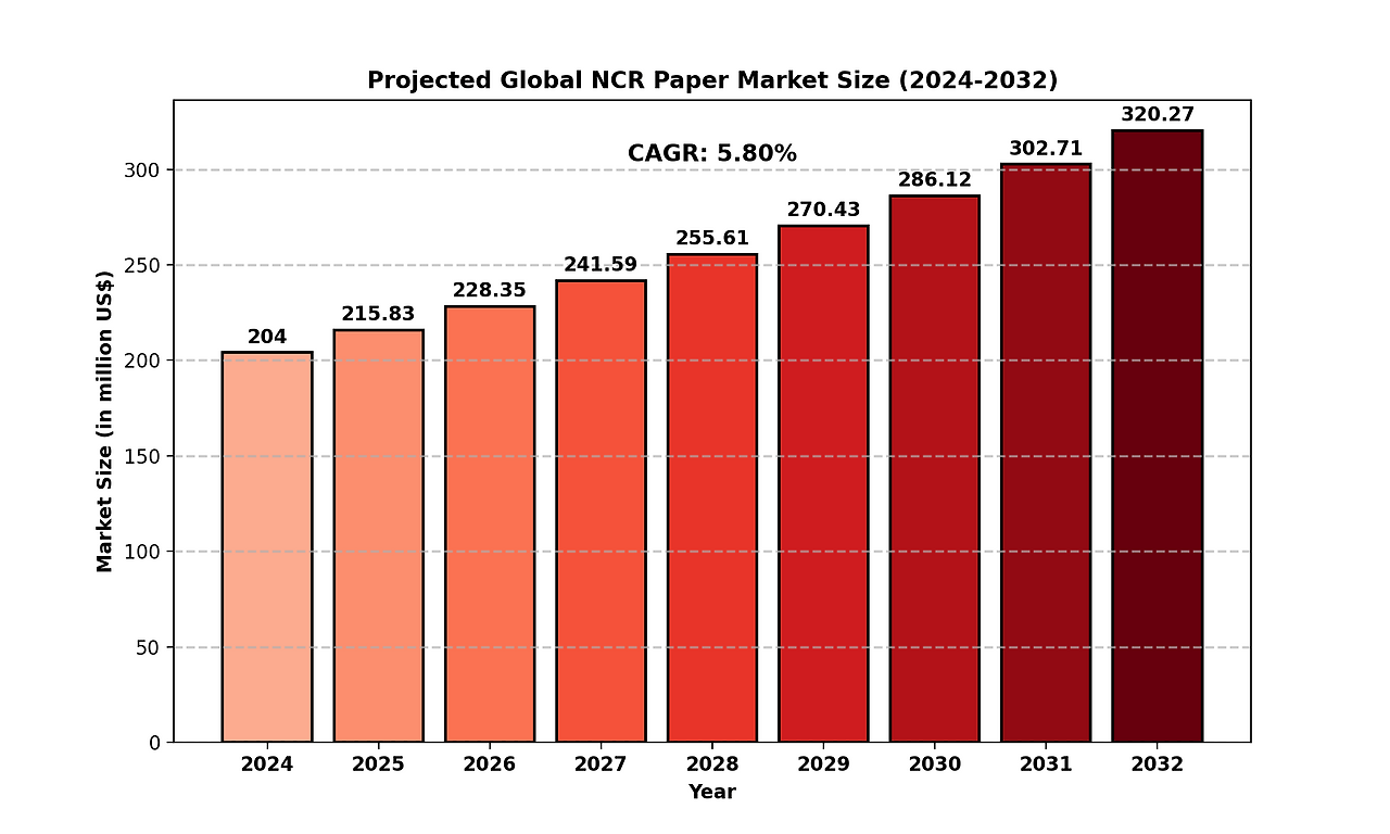 The global NCR paper market has shown promising growth, with an estimated market size of USD 204 million in 2024. It is expected to reach USD 320.27 million by 2032, growing at a compound annual growth rate (CAGR) of 5.80% during the forecast period.