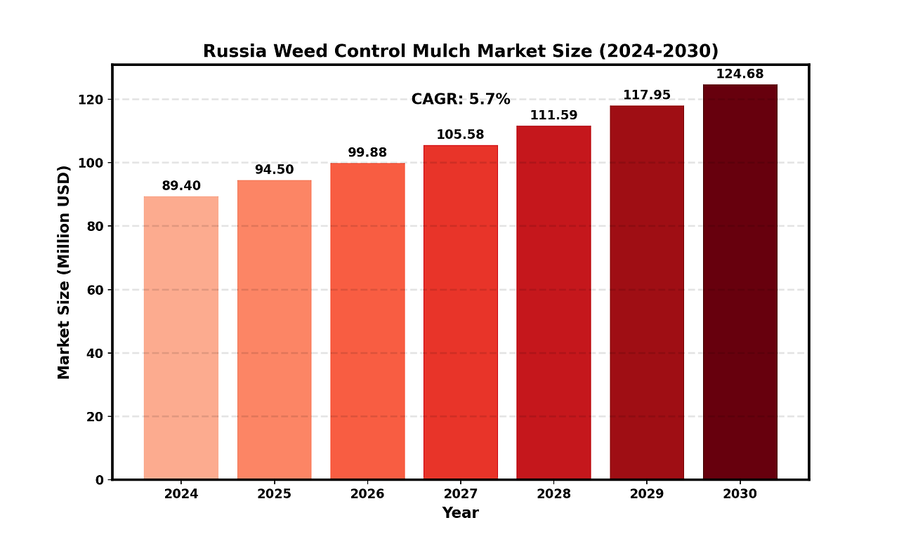 Russia Weed Control Mulch market size was valued at US$ 89.4 million in 2024 and is projected to reach US$ 124.6 million by 2030, at a CAGR of 5.7% during the forecast period 2024-2030.