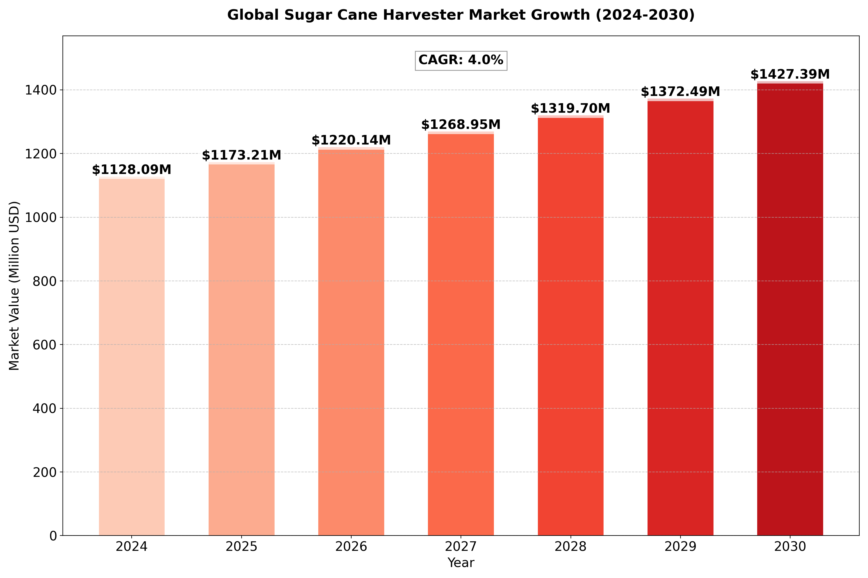 The Global Sugar Cane Harvester market was valued at US$ 1084.7 million in 2023 and is projected to reach US$ 1427.39 million by 2030, at a CAGR of 4.0% during the forecast period..