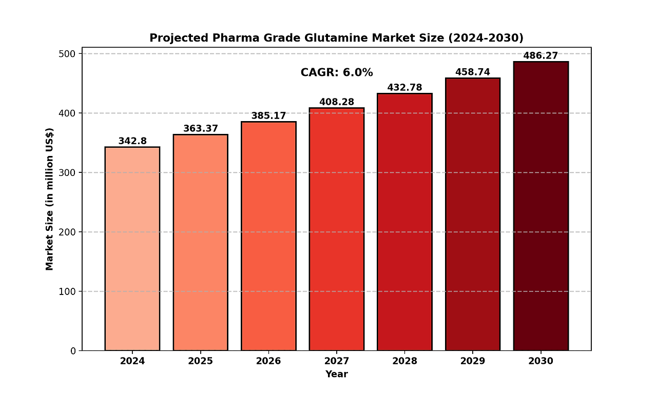 The global Pharma Grade Glutamine market size was valued at US$ 342.8 million in 2024 and is projected to reach US$ 486.2 million by 2030, at a CAGR of 6.0% during the forecast period