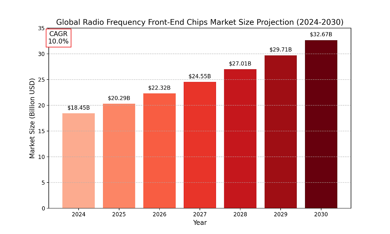 The "Global Radio Frequency Front-End Chips Market" size was valued at US$ 18.45 billion in 2024 and is projected to reach US$ 32.67 billion by 2030, at a CAGR of 10.0% during the forecast period 2024-2030.