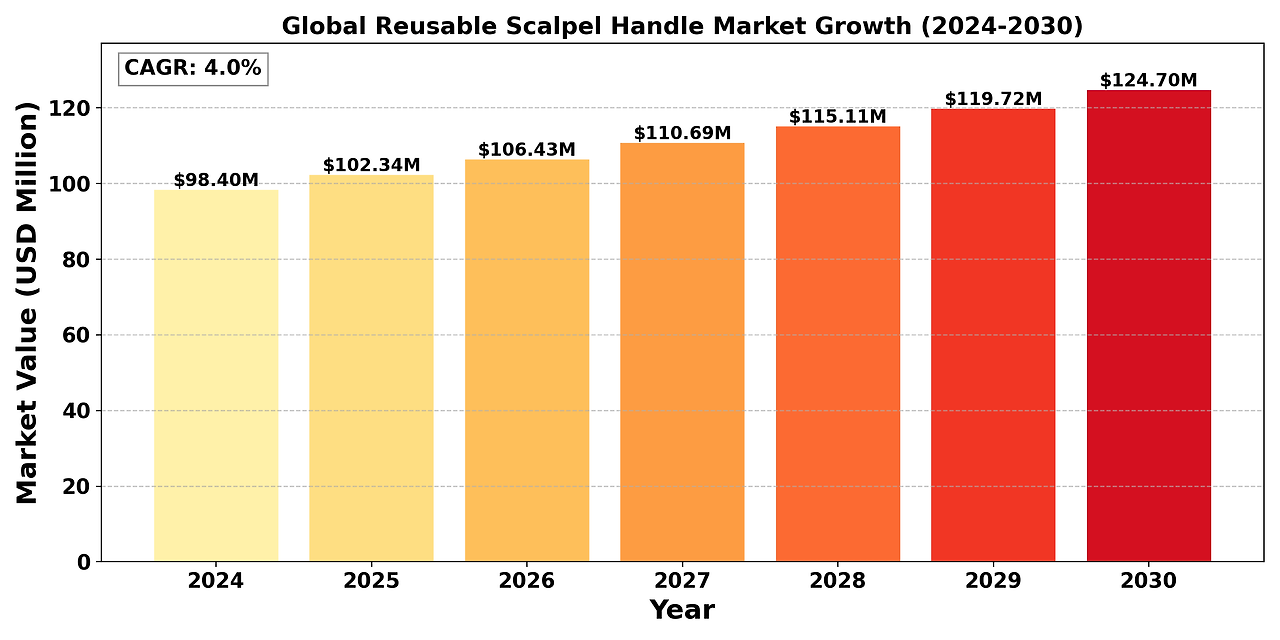 The global Reusable Scalpel Handle market size was valued at US$ 98.4 million in 2024 and is projected to reach US$ 124.7 million by 2030, at a CAGR of 4.0% during the forecast period 2024-2030.