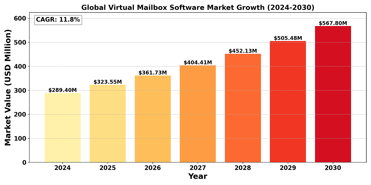 The "Global Virtual Mailbox Software Market" size was valued at US$ 289.4 million in 2024 and is projected to reach US$ 567.8 million by 2030, at a CAGR of 11.8% during the forecast period 2024-2030.