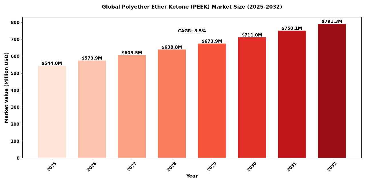 The "Global Polyether Ether Ketone (PEEK) Market" size was estimated at USD 544 million in 2025 and is projected to reach USD 791.3 million by 2032, exhibiting a CAGR of 5.50% during the forecast period.