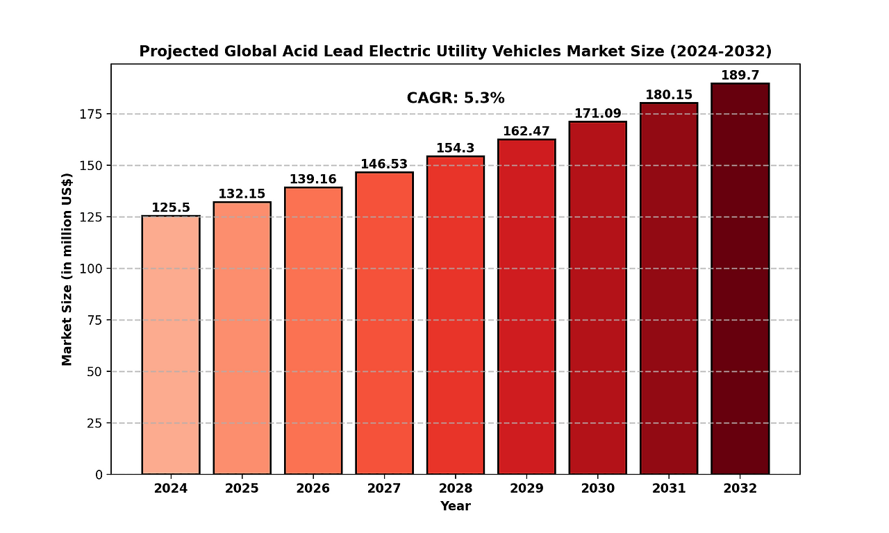 As of 2024, the global Acid Lead Electric Utility Vehicles market size is estimated at USD 125.50 million. It is projected to grow to USD 189.76 million by 2032, registering a Compound Annual Growth Rate (CAGR) of 5.30% during the forecast period.