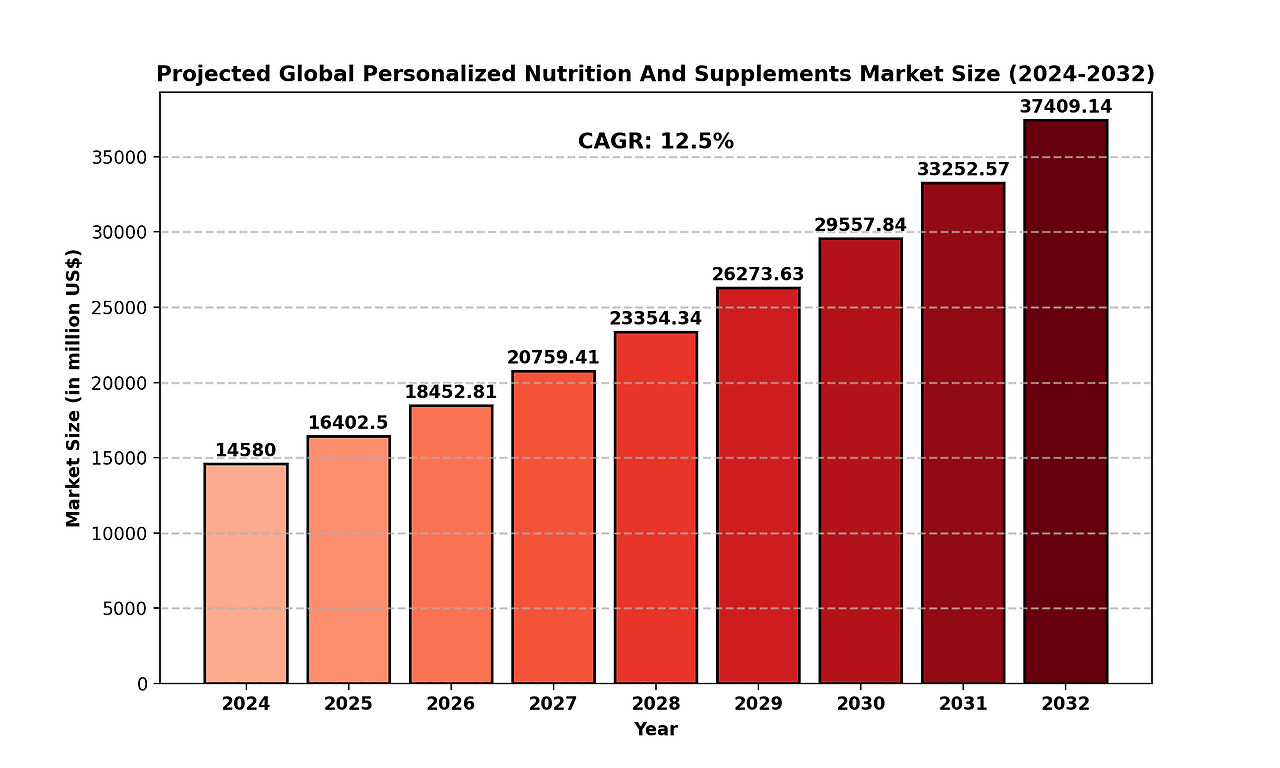 The Personalized Nutrition and Supplements market is projected to grow at a CAGR of 12.50% from 2024 to 2032.