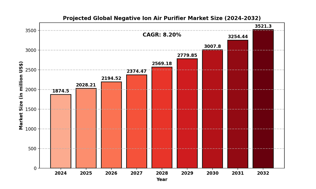 The Global Negative Ion Air Purifier Market was valued at approximately USD 1,874.50 million in 2024 and is projected to grow to USD 3,521.3 million by 2032, reflecting a CAGR of 8.20% during the forecast period.