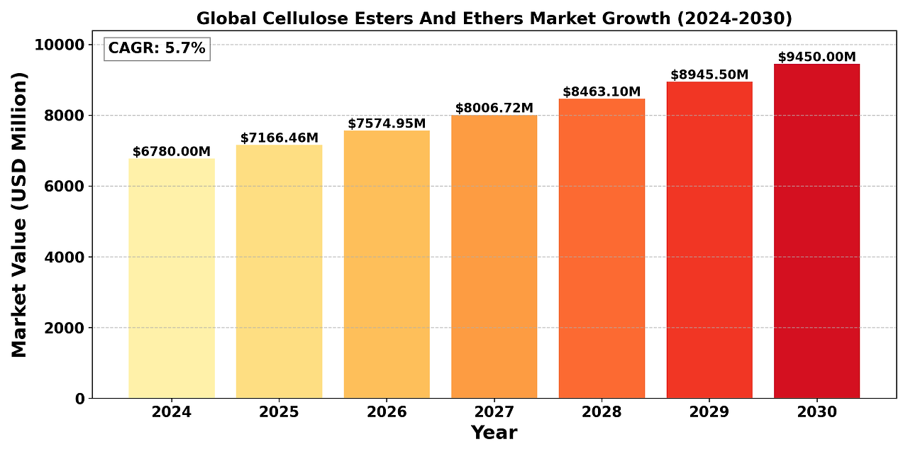 The "Global Cellulose Esters And Ethers Market" size was valued at US$ 6.78 billion in 2024 and is projected to reach US$ 9.45 billion by 2030, at a CAGR of 5.7% during the forecast period 2024-2030.