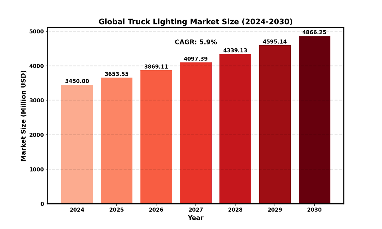 The global Truck Lighting market size was valued at US$ 3.45 billion in 2024 and is projected to reach US$ 4.866 billion by 2030, at a CAGR of 5.9% during the forecast period 2024-2030.