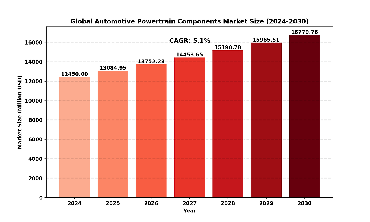 The global Automotive Powertrain Components market size was valued at US$ 12.450 billion in 2024 and is projected to reach US$ 16.779 billion by 2030, at a CAGR of 5.1% during the forecast period 2024-2030.
